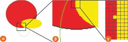 Εξετάζοντας προσεκτικά τη μεγέθυνση της Εικόνας 3.1α (Εικόνα 3.1β) μπορούμε να παρατηρήσουμε ατέλειες στο σχεδιασμό των καμπύλων γραμμών. Οι ατέλειες αυτές εμφανίζονται, όταν η μεγέθυνση είναι μεγάλη και τα εικονοστοιχεία αρχίζουν να ξεχωρίζουν ως χρωματιστές τετράγωνες περιοχές.