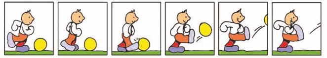 Τις ίδιες αρχές χρησιμοποιεί και ένα κινούμενο σχέδιο. Στην Εικόνα 3.4 υπάρχουν έξι σκίτσα, τα οποία εικονίζουν στιγμές από την προσπάθεια ενός παιδιού να κλωτσήσει μία μπάλα. Η γρήγορη εναλλαγή των σκίτσων αυτών στην οθόνη του υπολογιστή μάς δημιουργεί την αίσθηση της κίνησης.