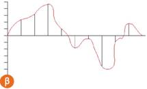 Εικόνα 3.6. (α) Η γραφική παράσταση της κυματομορφής ενός ήχου. (β) Η επιλογή συγκεκριμένων τιμών σε τακτά χρονικά διαστήματα για την καταγραφή ενός ήχου σε ψηφιακή μορφή. (γ) Σύγκριση της αναλογικής και ψηφιακής αναπαράστασης της κυματομορφής