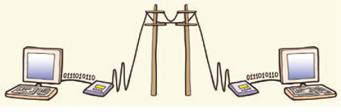 Μέχρι στιγμής ασχοληθήκαμε με τους τρόπους σύνδεσης υπολογιστών που βρίσκονται σε κοντινή απόσταση. Με ποιον τρόπο, όμως, μπορούμε να συνδέσουμε δυο υπολογιστές που βρίσκονται μακριά ο ένας από τον άλλο (π.χ. σε άλλη συνοικία, σε άλλη πόλη ή ακόμα και σε άλλη χώρα); Μια συνηθισμένη λύση δίνεται αξιοποιώντας τις τηλεπικοινωνιακές γραμμές (της σταθερής και κινητής τηλεφωνίας) με τη χρήση κατάλληλων συσκευών (π.χ. μόντεμ) (Εικόνα 4.6). |