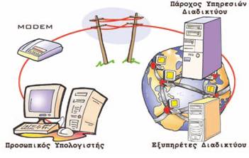 - η δυνατότητα σύνδεσης μέσω Πάροχου Υπηρεσιών Διαδικτύου (ISP-Internet Service Provider). Ο Πάροχος Υπηρεσιών Διαδικτύου μπορεί να είναι ιδιωτική εταιρεία ή δημόσιος οργανισμός (πχ. το Πανελλήνιο Σχολικό Δίκτυο, Πανεπιστήμιο), που μας παρέχει την δυνατότητα να έχουμε πρόσβαση στο Διαδίκτυο, αφού συνδεθούμε με τον κεντρικό υπολογιστή μέσω τηλεπικοινωνιακής γραμμής. Η σύνδεση γίνεται με τη χρήση κατάλληλου τηλεφωνικού αριθμού (ΕΠΑΚ), που μας δίνει ο Πάροχος. Για να έχουμε τη δυνατότητα σύνδεσης στον Πάροχο, συνήθως του καταβάλλουμε ένα οικονομικό αντίτιμο, ανάλογα με την τηλεπικοινωνιακή γραμμή που έχουμε: