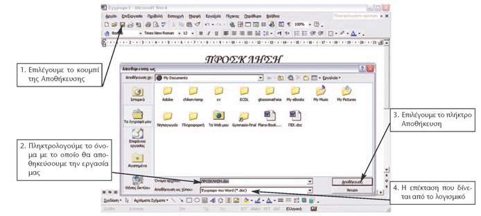 Η πρόσκληση αποθηκεύτηκε στο σκληρό δίσκο σε ψηφιακή μορφή (μια σειρά από Bytes, δηλαδή οκτάδες από 0 και 1). Πώς καταφέραμε, όμως, να την ανακτήσουμε ξανά μετά την αποθήκευσή της; Στο σκληρό δίσκο υπάρχουν αποθηκευμένα δισεκατομμύρια Bytes. Ποια από αυτά συνθέτουν την πρόσκληση που αποθηκεύσαμε; Ευτυχώς αυτή η ερώτηση δεν μας απασχολεί κάθε φορά που «ανοίγουμε» μία εργασία. Το μόνο που χρειάζεται είναι να επιλέξουμε το όνομα με το οποίο έχει αποθηκευτεί η συγκεκριμένη πρόσκληση. Το Λειτουργικό Σύστημα αναζητά στο σκληρό δίσκο τα κατάλληλα Bytes, που συσχετίζονται με το συγκεκριμένο όνομα και εμφανίζει την πρόσκληση στην οθόνη. Η ομάδα των Bytes που αποθηκεύτηκαν ως ενότητα και είναι συνδεδεμένα με ένα όνομα, αποτελούν ένα αρχείο.