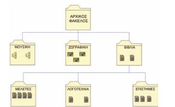 «ΜΟΥΣΙΚΗ», «ΖΩΓΡΑΦΙΚΗ», «ΒΙΒΛΙΑ». Επίσης ο φάκελος «ΒΙΒΛΙΑ» περιέχει με τη σειρά του τους φακέλους «ΜΕΛΕΤΕΣ», «ΛΟΓΟΤΕΧΝΙΑ» και «ΕΠΙΣΤΗΜΕΣ».