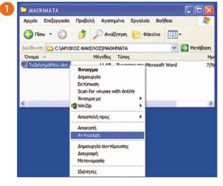 - 1. Με δεξιά επιλογή πάνω στο όνομα του αρχείου «ΤοΔιηγημάΜου.doc» ενεργοποιούμε το μενού επιλογών και επιλέγουμε «Αντιγραφή»