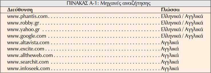 χρήστης μπορεί να αναζητήσει στο διαδίκτυο πληροφορίες μεσω συγκεκριμένων λεξεων, ή προτάσεων. Στον πίνακα A-1 δίνονται μερικές από τις πιο