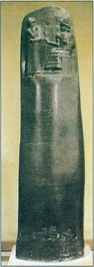 «Η στήλη του Χαμουραμπί». (Παρίσι, Μουσείο Λούβρου). Στη στήλη εικονίζεται ο Χαμουραμπί, όρθιος αριστερά, να δέχεται τη νομοθεσία από τον θεό Σαμάς. Στο κάτω μέρος της στήλης είναι γραμμένη, σε σφηνοειδή γραφή, η νομοθεσία του Βαβυλώνιου βασιλιά. |