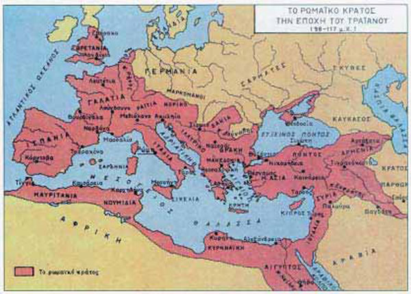 Στις αρχές του 2ου αιώνα μ.Χ. ο αυτοκράτορας Τραϊανός (28-117 μ.Χ.) καταλαμβάνει τη Δακία και ορισμένες περιοχές προς την Ανατολή. Αλλά μετά τον θάνατό του οι διάδοχοί του δεν επιδιώκουν πια την επέκταση της αυτοκρατορίας. Τεράστια σε έκταση, η αυτοκρατορία εκτείνεται γύρω από τη Μεσόγειο και από την Αγγλία προς βορρά μέχρι την Άνω Αίγυπτο προς Νότο. |