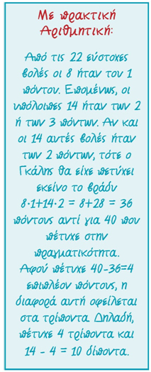 Άρα, ο Γκάλης εκείνο το βράδυ πέτυχε 4 τρίποντα (και φυσικά 14 - 4 = 10 δίποντα).