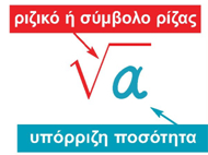 Τετραγωνική ρίζα ενός θετικού αριθμού α, λέγεται ο θετικός αριθμός, ο οποίος, όταν υψωθεί στο τετράγωνο, δίνει τον αριθμό α. Η τετραγωνική ρίζα του α συμβολίζεται με
