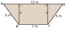H διατομή ενός καναλιού είναι σχήματος ισοσκελούς τραπεζίου με πλευρές: ΓΔ = ΑΒ = 5 m, ΒΓ = 7 m και ΑΔ = 13 m. Να υπολογίσετε το ύψος x του καναλιού