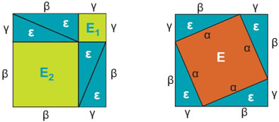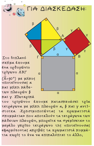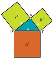 α² = β² + γ², δηλαδή το εμβαδόν του μεγάλου πορτοκαλί τετραγώνου είναι ίσο με το άθροισμα των εμβαδών των δύο πράσινων τετραγώνων.