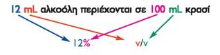 2.3.3 Περιεκτικότητα διαλύματος στα εκατό όγκο προς όγκο (% v/v) Οι περιεκτικότητες που γνωρίσαμε παραπάνω χρησιμοποιούνται κυρίως όταν η διαλυμένη ουσία είναι στερεή ή υγρή. Στα διαλύματα αλκοόλης σε νερό (ποτά) και στα διαλύματα αερίων σε αέριο (π.χ. οξυγόνο ή διοξείδιο του άνθρακα στον αέρα) χρησιμοποιούμε συνήθως μια άλλη έκφραση περιεκτικότητας. Στην ετικέτα ενός μπουκαλιού με κόκκινο κρασί διαβάζουμε: αλκοόλη 12 νοl. Η έκφραση 12 νοl, η οποία στην ολοκληρωμένη μορφή της είναι 12% ν/ν, δηλώνει την περιεκτικότητα ενός διαλύματος στα εκατό όγκο προς όγκο και είναι μια συντομογραφία της σχέσης: