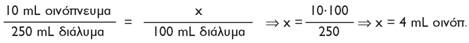 Άρα περιέχονται 4 mL οινόπνευμα ανά 100 mL διαλύματος, δηλαδή η περιεκτικότητα του διαλύματος αυτού στα εκατό όγκο προς όγκο είναι 4% v/v. |