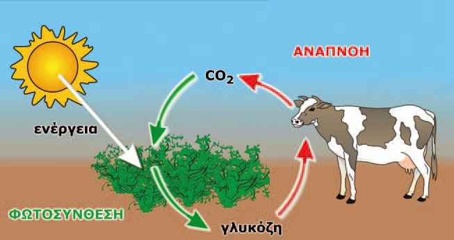 Αέριο απαραίτητο για τη ζωή Από την κυτταρική αναπνοή παράγεται CO2, το οποίο χρησιμοποιείται στη φωτοσύνθεση (σελ. 60). Αυτές οι δύο διαδικασίες είναι πολύ σημαντικές για τη διατήρηση της ζωής, επειδή διατηρούν σταθερή την περιεκτικότητα της ατμόσφαιρας σε CO2. Η κυτταρική αναπνοή και η φωτοσύνθεση αποτελούν το κυριότερο μέρος του κύκλου του άνθρακα.