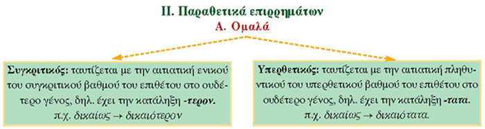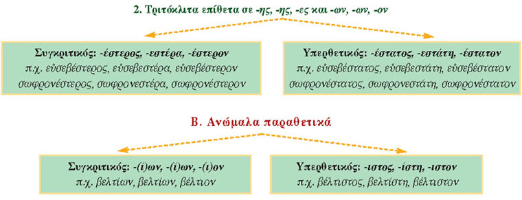 Συγκριτικός: μᾶλλον + θετικός βαθμός επιθέτου Υπερθετικός: μάλιστα + θετικός βαθμός επιθέτου