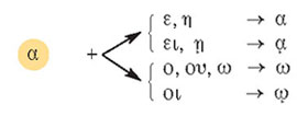 Γ. Γραμματική Τα συνηρημένα ρήματα✦ Να παρατηρήσετε τους παρακάτω ρηματικούς τύπους του κειμένου της Ενότητας: λυπεῖται, ἡγεῖται, ἐπιθυμεῖ, δοκεῖ. Οι καταλήξεις τους μοιάζουν με τις αντίστοιχες καταλήξεις των βαρύτονων ρημάτων, διαφέρει όμως ο τονισμός τους. Πρόκειται για τα συνηρημένα ή περισπώμενα ρήματα. ✦ Συνηρημένα είναι τα φωνηεντόληκτα ρήματα των οποίων ο χαρακτήρας -α-, -ε- ή -ο- συγχωνεύεται (συναιρείται) με το ακόλουθό του φωνήεν της κατάληξης. Αυτή η συγχώνευση ονομάζεται συναίρεση (πβ. ν.ε.: αγαπάει, αγαπά). Αλλιώς αποκαλούνται περισπώμενα, γιατί στο α΄ ενικό πρόσωπο της οριστικής ενεστώτα ε.φ. παίρνουν περισπωμένη. Οι τάξεις των συνηρημένωνΔιακρίνουμε τρεις τάξεις συνηρημένων με βάση τον χαρακτήρα τους: Διαδικασία σχηματισμού συνηρημένων ρημάτωνΟι συναιρέσεις αφορούν μόνο τον ενεστώτα και τον παρατατικό σε όλες τις εγκλίσεις τους. ✦ Γράφουμε και τονίζουμε σύμφωνα με όσα ισχύουν στα βαρύτονα ρήματα την ασυναίρετη μορφή του ρήματος, π.χ. τιμάω, τιμάεις, τιμάει, τιμάομεν, τιμάετε, τιμάουσι(ν). ✦ Κατόπιν συναιρούμε τον χαρακτήρα με το φωνήεν ή τη δίφθογγο της κατάληξης που ακολουθεί αμέσως μετά, σύμφωνα με τον πίνακα συναιρέσεων της τάξης στην οποία ανήκει το ρήμα, π.χ. τιμάετε → τιμᾶτε. ✦ Προσοχή στον σχηματισμό του απαρεμφάτου ενεργητικού ενεστώτα: σχηματίζεται με την αρχαιότερη κατάληξη -εν και όχι με την -ειν! Γι’ αυτό και στην α΄ τάξη συνηρημένων το απαρέμφατο δεν παίρνει υπογεγραμμένη (τιμᾶν). Η θέση του τόνου α) Αν στον ασυναίρετο τύπο ο τόνος δε βρίσκεται σε μία από τις συναιρούμενες συλλαβές, μένει στη θέση που ήταν και όποιος ήταν, π.χ. ἐσκόπεον → ἐσκόπουν. β) Αν στον ασυναίρετο τύπο ο τόνος βρίσκεται σε μία από τις συναιρούμενες συλλαβές, τότε τονίζεται η συλλαβή που προήλθε από τη συναίρεση, π.χ. σκοπέω → σκοπῶ. Το είδος του τόνου Aν η συλλαβή που προέρχεται από τη συναίρεση βρίσκεται: α) στην προπαραλήγουσα, οξύνεται, π.χ. ἐσκοπεόμεθα → ἐσκοπούμεθα. β) στην παραλήγουσα, παίρνει περισπωμένη, εφόσον η λήγουσα είναι βραχύχρονη, διαφορετικά οξύνεται, π.χ. σκοπέετε → σκοπεῖτε, αλλά σκοπεέτω → σκοπείτω. γ) στη λήγουσα, περισπάται, π.χ. σκοπέω → σκοπῶ. Α΄ τάξη συνηρημένων ρημάτων (-άω, -ῶ)Οι συναιρέσεις