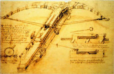 Γιγάντιος καταπέλτης, σχέδιο του Λεονάρντο ντα Βίντσι (Codex Atlanticus, 1499, Βιβλιοθήκη Αmbrosiana, Μιλάνο). Ο Ντα Βίντσι εφηύρε πολλούς αιώνες μετά τον Αρχιμήδη πολεμικές μηχανές, όπως ο καταπέλτης, οι οποίες χρησιμοποιήθηκαν για την άμυνα των ιταλικών πόλεων-κρατών.