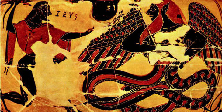 Ο Τυφών, το τέρας με την εκπληκτική δύναμη που λίγο έλειψε να ανατρέψει τους θεούς και να κυβερνήσει τον κόσμο, νικήθηκε από τους κεραυνούς του Δία και τελικά καλύφθηκε από το σικελικό βουνό της Αίτνας ή γκρεμίστηκε στον Τάρταρο (Αρχαιολογικό Μουσείο Μονάχου).