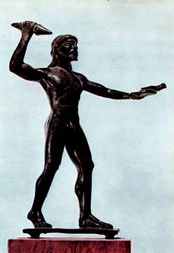Χάλκινο αγαλματίδιο που προέρχεται από την Αμβρακία και παριστάνει τον Δία ως «κεραύνιο»: στο ένα χέρι του κρατά τον κεραυνό και στο άλλο έναν αετό, σύμβολα της θεϊκής του δύναμης (5ος αι.π.Χ., Αθήνα, Εθνικό Αρχαιολογικό Μουσείο).