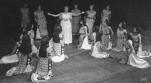 Η Άννα Συνοδινού ως Ελένη με τον Χορό των γυναικών σε παράσταση της ομώνυμης τραγωδίας του Ευριπίδη από το Εθνικό Θέατρο (1962)