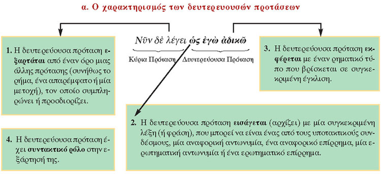 Για να χαρακτηρίσουμε με ολοκληρωμένο τρόπο μια δευτερεύουσα πρόταση, πρέπει να αναφερθούμε σε όλα τα παραπάνω στοιχεία, δηλαδή να δηλώσουμε από πού εξαρτάται, πώς εισάγεται, πώς εκφέρεται και ποιος είναι ο συντακτικός ρόλος της.
