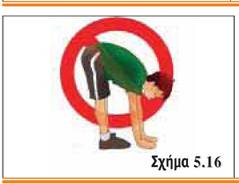 | Λάθος άσκηση: Δίπλωση του κορμού από την όρθια θέση (σχήμα 5.16). Η άσκηση μπορεί να προκαλέσει αλλοιώσεις στην οσφυοϊερή άρθρωση και διάταση των συνδέσμων του γόνατος. |