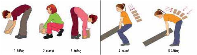 Στις εικόνες βλέπουμε μαθητές να ανασηκώνουν ένα βαρύ αντικείμενο από το έδαφος με δυο διαφορετικούς τρόπους. Στις περιπτώσεις (1) και (3) η επιβάρυνση είναι μεγαλύτερη και ανομοιόμορφη καθιστώντας τον τρόπο αυτό μεταφοράς αντικειμένου επικίνδυνο και ως εκ τούτου πρέπει να αποφεύγεται. Στην περίπτωση (2) η σπονδυλική στήλη του μαθητή δέχεται ομοιόμορφη επιβάρυνση. Οι επιβαρύνσεις της σπονδυλικής στήλης φαίνονται σχηματικά στα επόμενα 2 σκίτσα (4 και 5). |