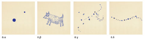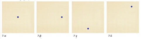 Β. Ένα σημείο στο κέντρο της επιφάνειας είναι μια πρώτη ζωγραφική εικόνα που δίνει την εντύπωση ότι σπάει τη σιωπή του άδειου χώρου και παράγει τον πρώτο “εικαστικό ήχο” προσδίδοντας μια αίσθηση ακινησίας και στατικότητας (Εικ.7.α). Ένα σημείο στο πλάι μοιάζει να έχει κάποια κίνηση (Εικ.7.β), στο κάτω μέρος μοιάζει να πέφτει (Εικ.7.γ), ενώ στο επάνω μέρος να πετάει (Εικ.7.δ). Το σχήμα των σημείων, το μέγεθος, η θέση και το πλήθος τους καθορίζουν τη σύνθεση. Όταν ένα σημείο είναι μεγάλο μοιάζει να είναι μπροστά, ενώ όταν είναι μικρό δείχνει να φεύγει, να απομακρύνεται (Εικ.8.α). Πολλά σημεία, κοντά το ένα στο άλλο φαίνονται σαν ένα σώμα (Εικ.8.β). Όταν είναι σε απόσταση μεταξύ τους, αναδεικνύεται η μοναδικότητα του καθενός και η σύνθεση είναι χαλαρή και ανάλαφρη. Σημεία με διαφορετικά σχήματα αυξάνουν την ένταση. Σημεία διασκορπισμένα σε μια επιφάνεια δημιουργούν ένταση και κινητικότητα (Εικ.8.γ). Τοποθετημένα με κάποια αναγνωρίσιμη διάταξη δημιουργούν σταθερότητα και ηρεμία (Εικ.8.δ).