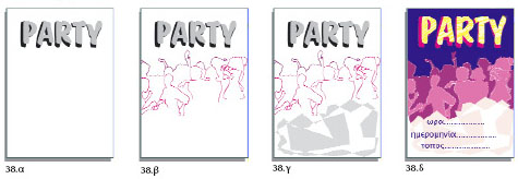 Η διαδικασία σχεδιασμού της αφίσας: α) σχεδιάζουμε τα βασικά γράμματα του θέματος στο οποίο αναφέρεται η αφίσα (μπορούμε να τα σκιάσουμε για να τονιστούν) (Εικ.38.α), β) σχεδιάζουμε την εικόνα που πρέπει να αναφέρεται στο θέμα (Εικ.38.β), γ) γράφουμε όλα τα στοιχεία που περιέχει το μήνυμα (μπορούμε να χρησιμοποιήσουμε διαφορετικά γράμματα) (Εικ.38.γ), δ) ολοκληρώνουμε χρωματίζοντας και βελτιώνοντας τις λεπτομέρειες (Εικ.38.δ).