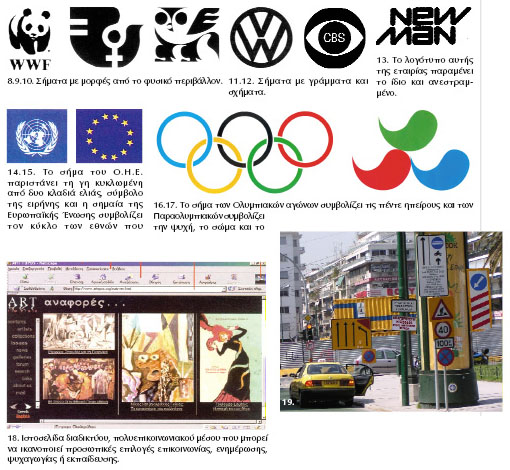 1.2.α. Σχέδιο γραφιστικής Η εποχή μας χαρακτηρίζεται από πολλούς ως «η εποχή της εικόνας». Ο σύγχρονος άνθρωπος υφίσταται καταιγισμό εικόνων από ποικίλες πηγές, που με διάφορους τρόπους και μέσα εκπέμπουν αδιάκοπα οπτικά μηνύματα. Το σχέδιο γραφιστικής παίζει σήμερα ουσιαστικό ρόλο, καθώς με τις πολλές εφαρμογές του εξυπηρετεί την άμεση μετάδοση του οπτικού μηνύματος. ![]() Τι αίσθηση σας δημιουργεί η τοποθέτηση σημάτων και πινακίδων στην εικόνα 19;