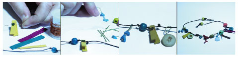 Κατασκευή κολιέ: δημιουργούμε τη σύνθεση περνώντας σε κυρωμένο σπάγκο ή δέρμα εναλλάξ χάντρες και λωρίδες από δέρμα, που από πριν έχουμε διπλώσει και δέσει με λεπτό σύρμα.