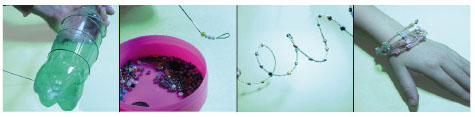 Κατασκευή βραχιολιού: α) τυλίγουμε σύρμα σε κυλινδρικό δοχείο για να φορμαριστεί, β) λυγίζουμε τη μια άκρη καιπερνάμε διάφορες χάντρες μέχρι να γεμίσει το σύρμα.