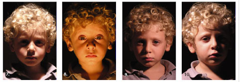 Πώς παρουσιάζεται το πρόσωπο του παιδιού στις φωτογραφίες 7, 8, 9 και 10; Τι έκφραση παίρνει στην κάθε μια και πού οφείλεται; Πώς αποδίδουμε το κοντράστ στη ζωγραφική; Ξεφυλλίστε το βιβλίο σας και βρείτε έργα ατμοσφαιρικής ζωγραφικής.